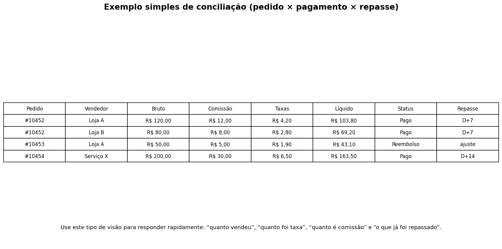 - Relatórios e conciliação: como bater pedido × transação × repasse.