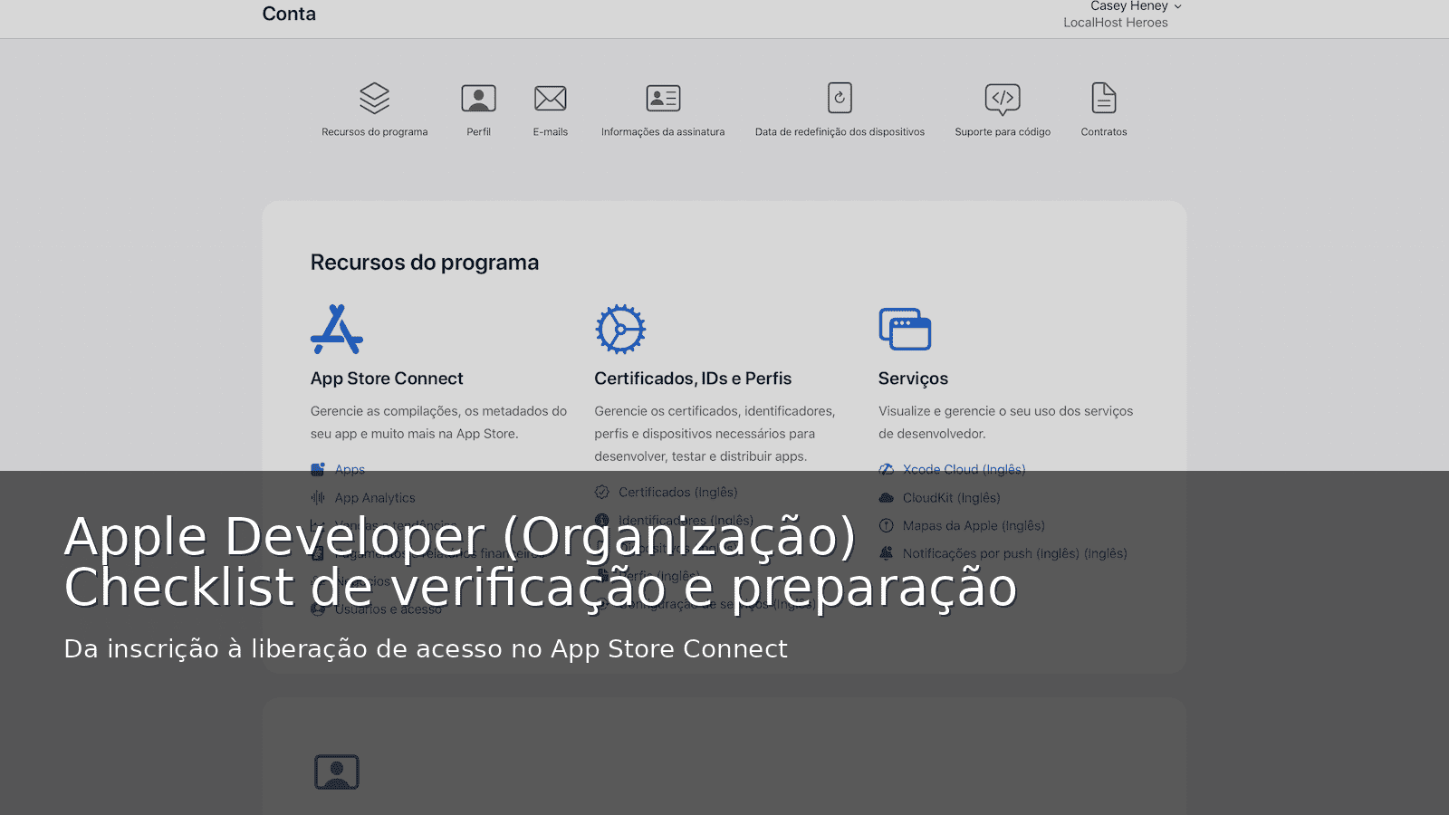 Verificação da conta Apple Developer (Organização) e preparação do App Store Connect