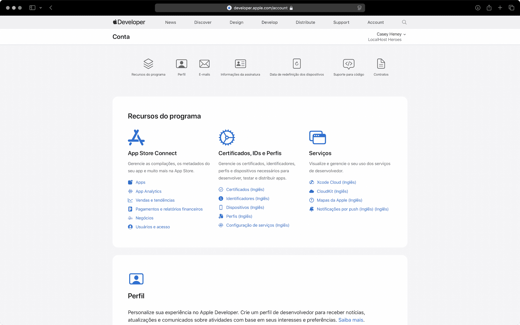 Página “Conta” no Apple Developer
